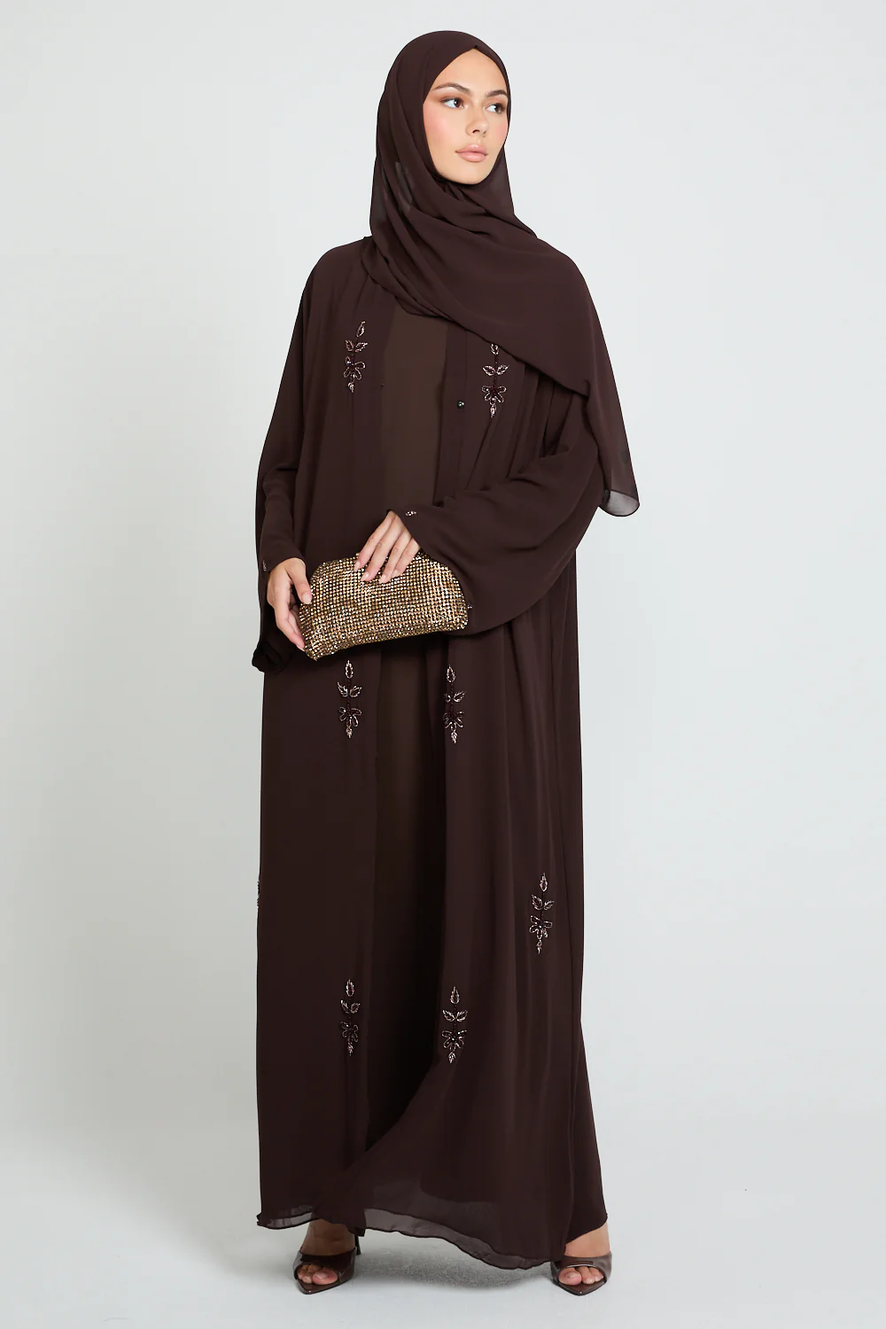 Embrace the perfect harmony of strength and softness with the Dusky Petal Embellished Chiffon Open Abaya in Mahogany Rouge. Crafted from ethereal chiffon, this open abaya flows gracefully, capturing light and movement with every step.