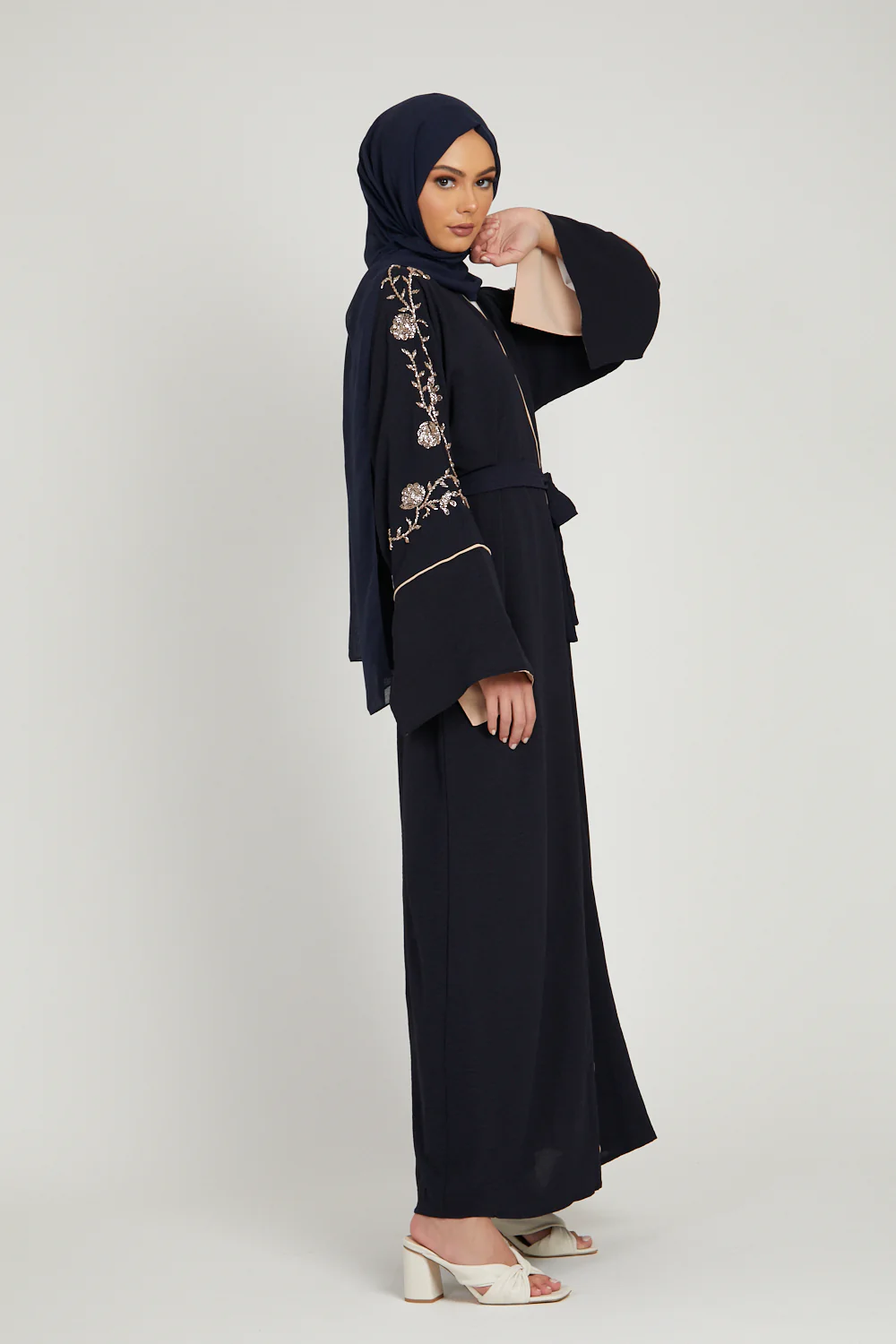 -70%Floral Embellished Contrast Cuff Open Abaya - Deep Navy—