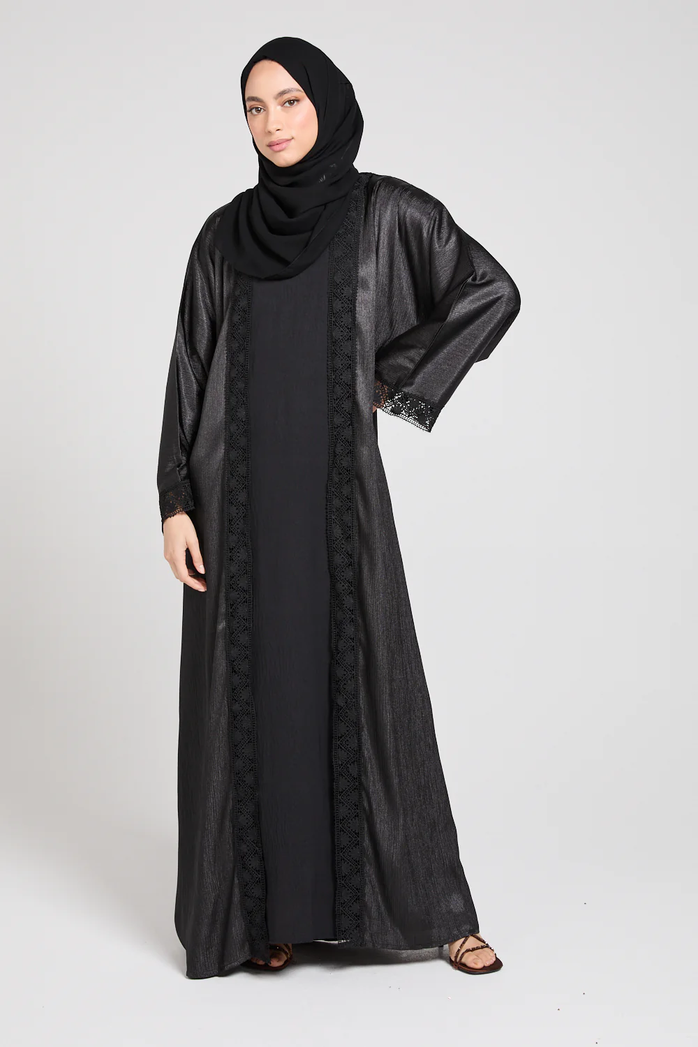 Be effortlessly trendy with this four piece open abaya set. Featuring lace detailing on the lapel and cuff. this classic set is perfect for any occasion. Keep things minimal yet glamorous with this versatile piece.