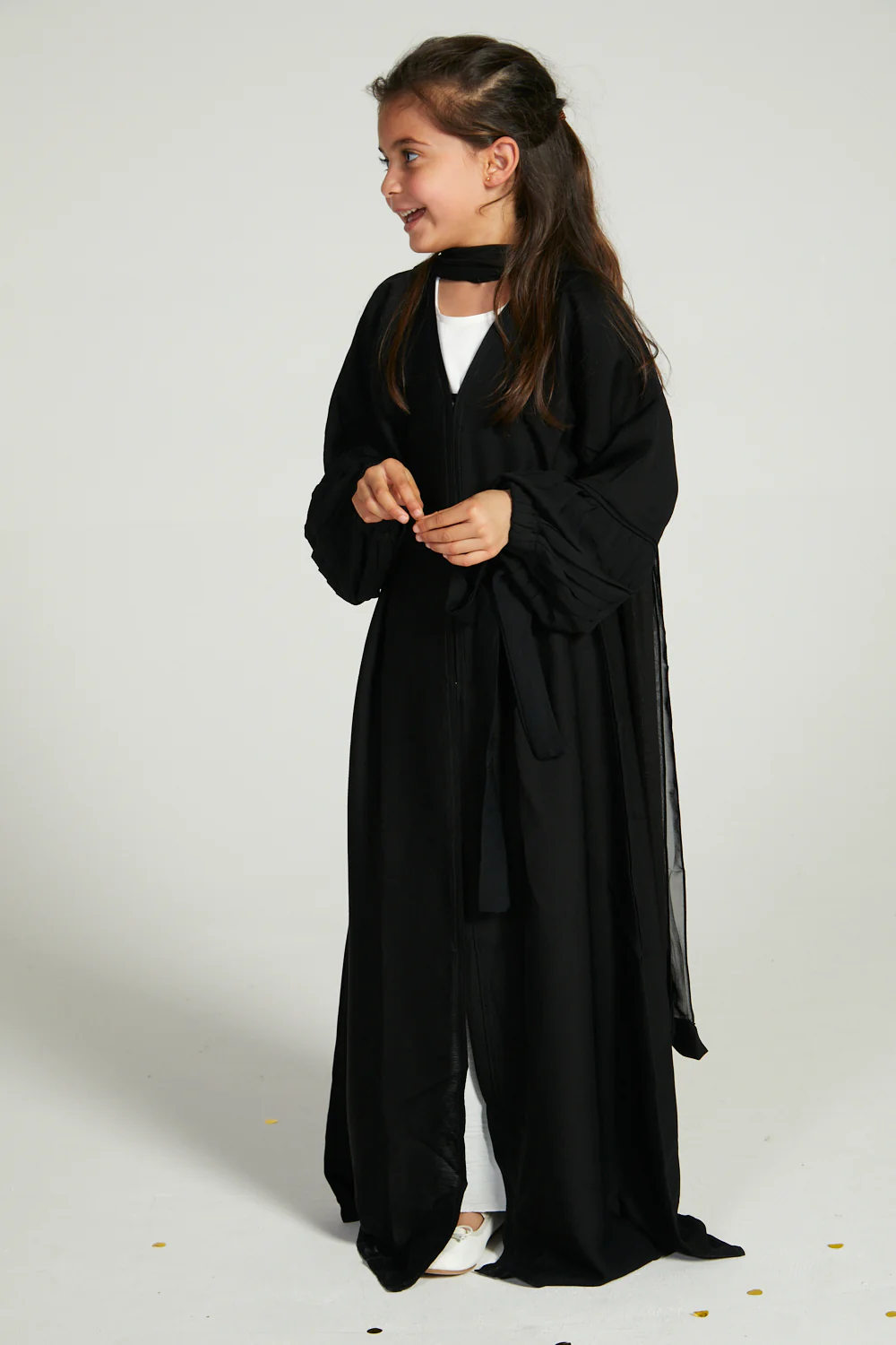 Junior Girls Premium Textured Open Abaya with Pleated Cuffs - Black