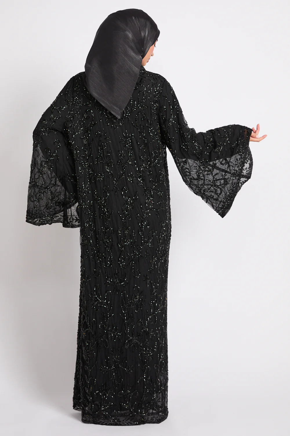 Luxury Starlit Bloom Embellished Open Abaya - Black