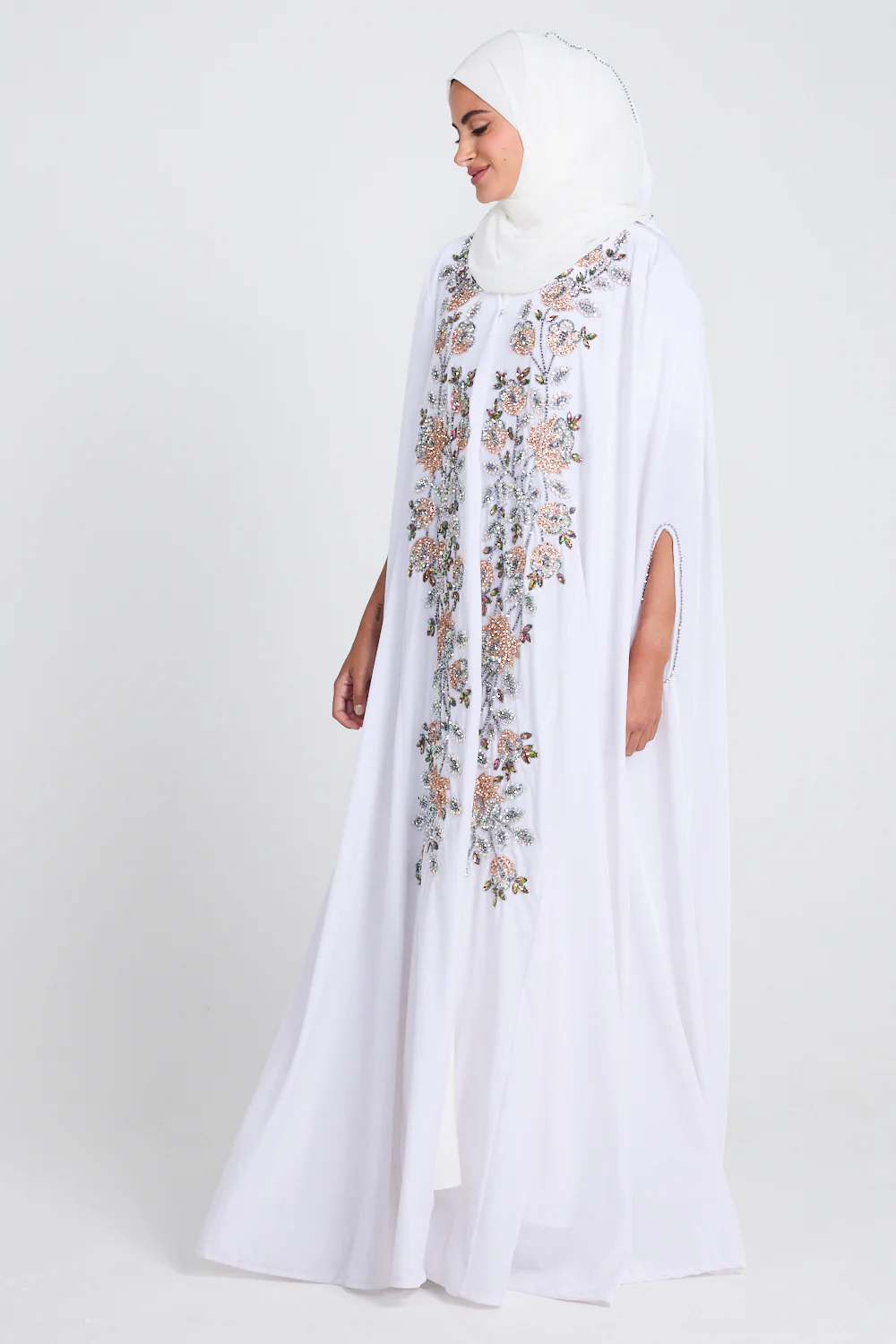 Step into a world of refined beauty with the Luxury White Blossom Velvet Embellished Cape. Crafted from the softest velvet in a pristine white hue, this cape offers a radiant glow that exudes purity and sophistication. The delicate, hand-stitched rose gold floral blossom embellishments bring a touch of nature's elegance to the design, intertwining opulence and artistry in every detail.