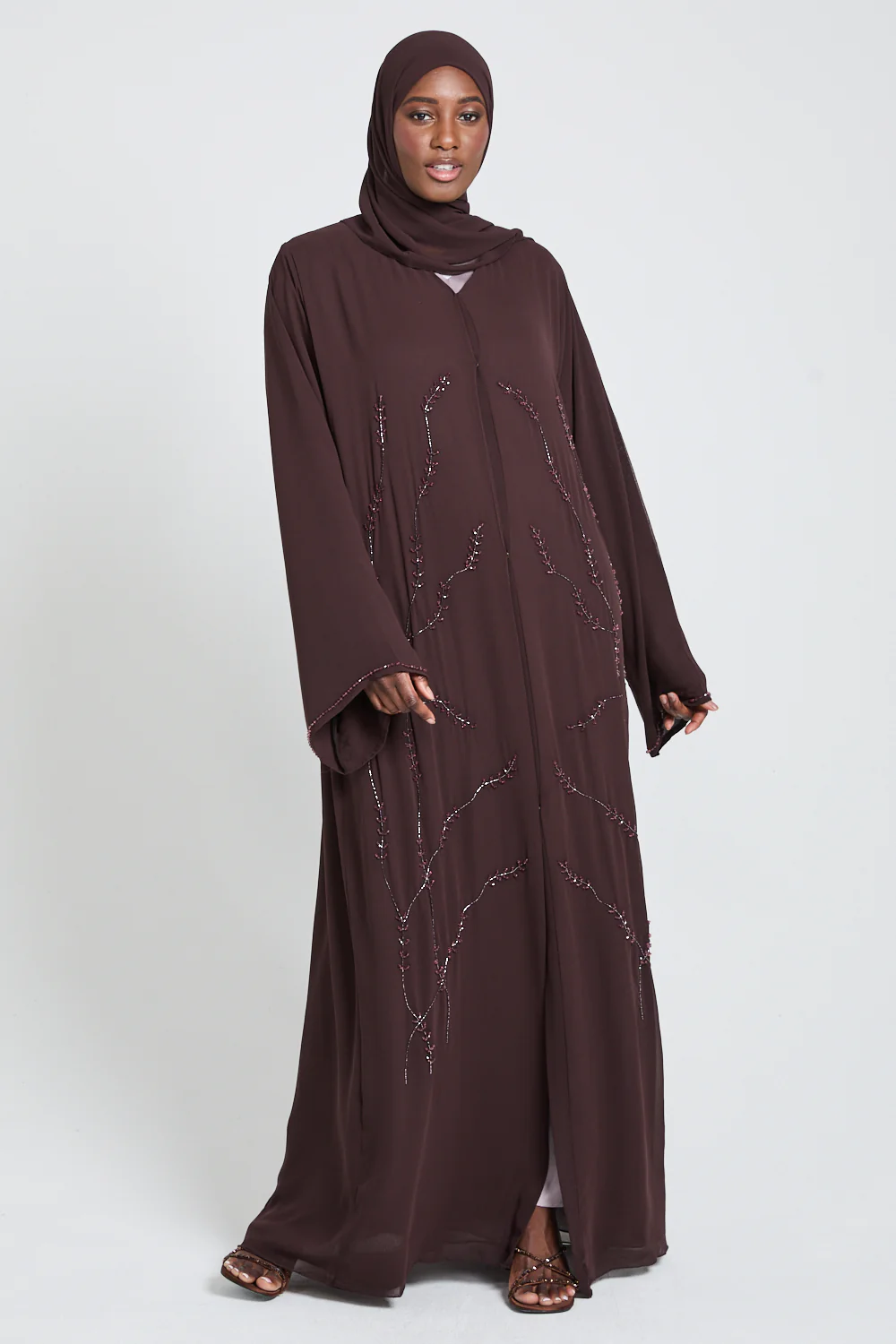 The rich mahogany hue exudes warmth and sophistication, making this abaya perfect for both everyday wear and special occasions. Its subtle yet striking embellishments create a look that’s effortlessly chic and full of life.