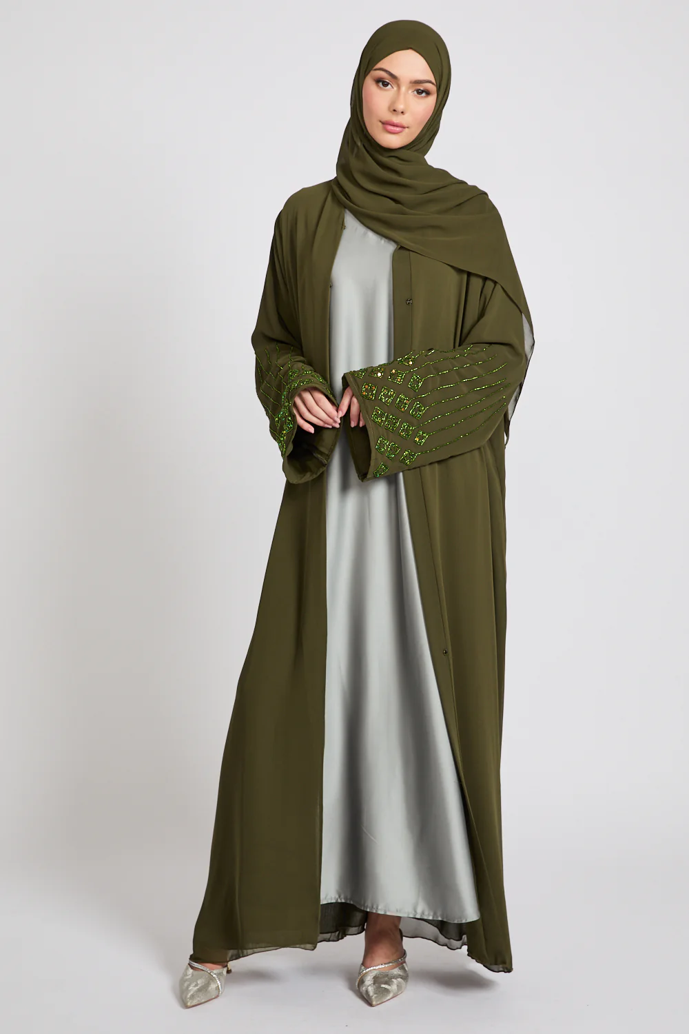 Introducing the Olive Chiffon Open Abaya with Jewelled Cuff—a perfect blend of elegance and luxury. Crafted from soft, flowing chiffon, this abaya drapes beautifully, offering a lightweight, breathable feel that's perfect for any occasion.