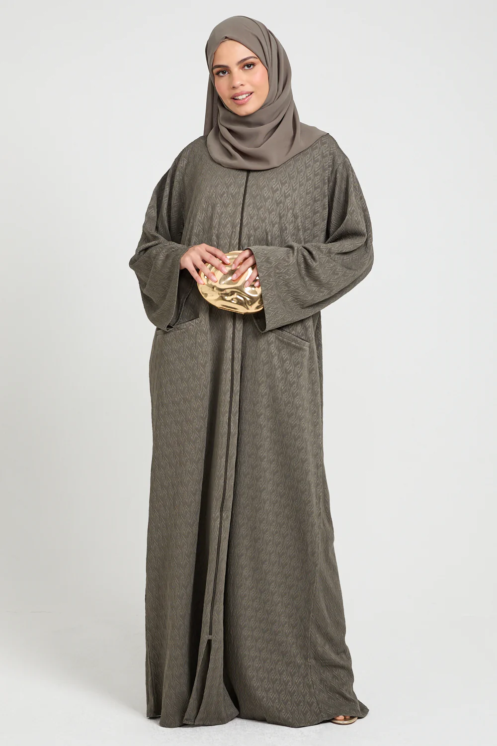 In its deep olivewood tone - an elegant blend of muted olive and earthy taupe, this abaya embodies warmth, taste, and quiet confidence. A versatile neutral that complements every complexion, every scarf palette, every setting.