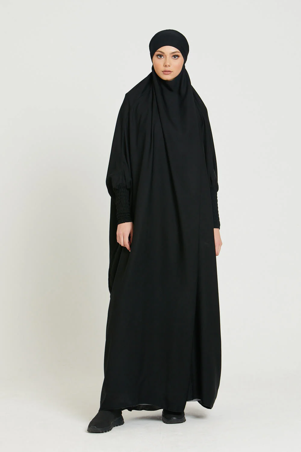 Comfortable, simple and classy, our full-length one-piece prayer abaya/jilbab in black is perfectly lightweight, made from soft, lightweight nidha fabric, and is ideal for daily wear or prayers. The classic black colour and elasticated wrists of this one-piece prayer abaya makes it a modest wardrobe staple which will see you through the year in style and comfort whatever the weather.