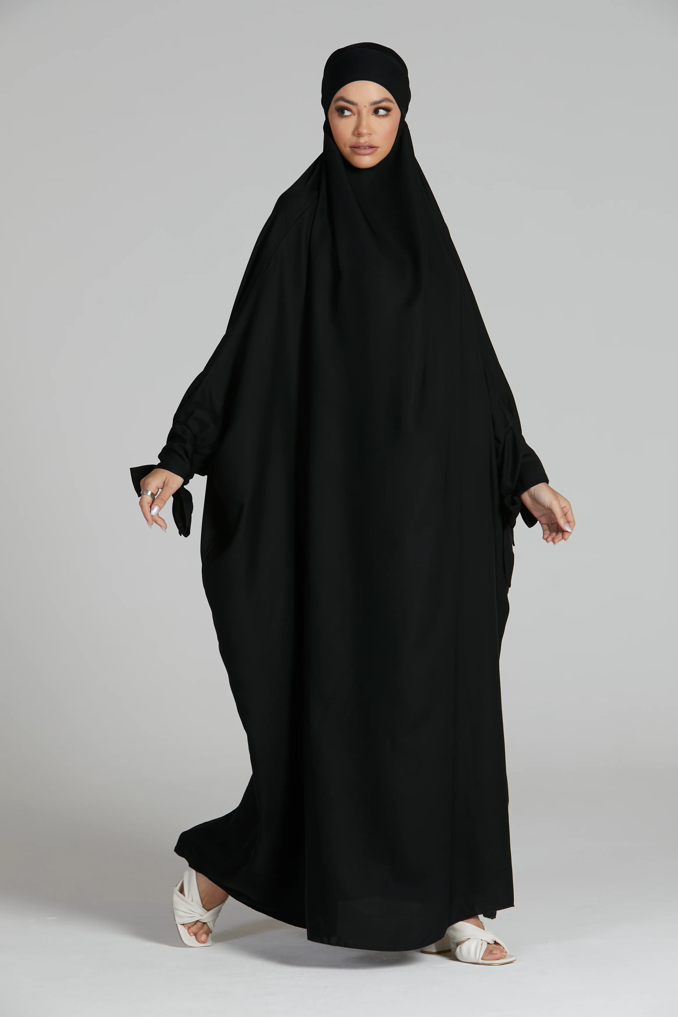 One Piece Full Length Jilbab/Prayer Abaya - Tie Up Cuffs - Black