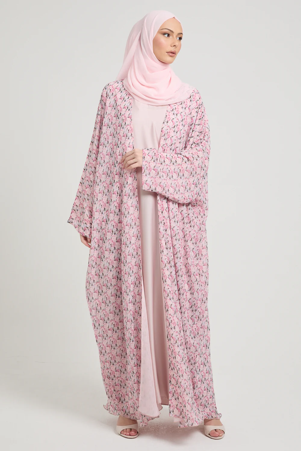 Its pastel blush base, interwoven with hints of soft lilac, dusty rose, and muted cream, evokes the freshness of spring blooms - refined, uplifting, and timelessly feminine. The relaxed cut and wide draped sleeves enhance movement, making it a perfect layer over abayas, dresses, or resort-wear neutrals.