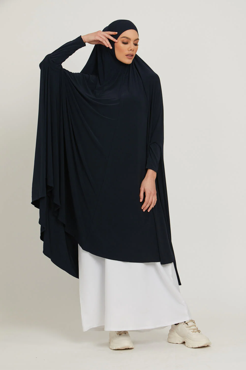 The perfect jersey jilbab - a staple for performing your Salah and a must-have for Hajj/Umrah - in navy. This navy jersey jilbab has a stud fastening under the chin for maximum comfort, with full-length wudu-friendly sleeves.
