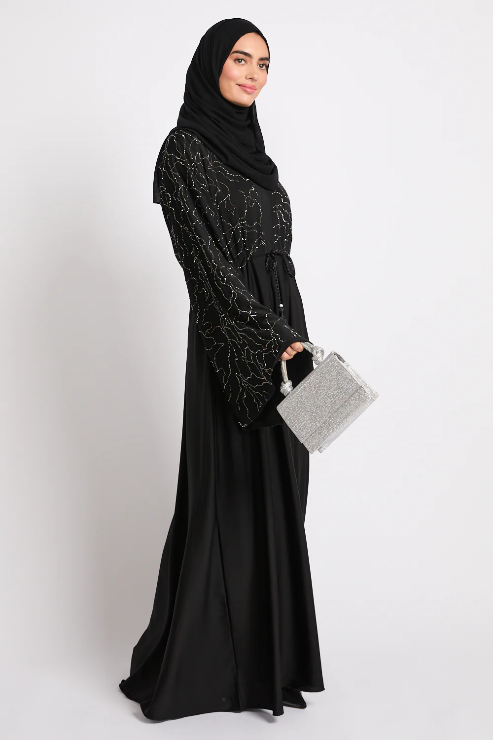 Delicate embellishments trace the fabric in subtle constellations, catching the light with every step. They do not shout; they glow - adding depth, texture, and an unmistakable sense of luxury. The inner belt gently defines the waist, allowing the abaya to fall in a controlled, graceful cascade that flatters without restraint.