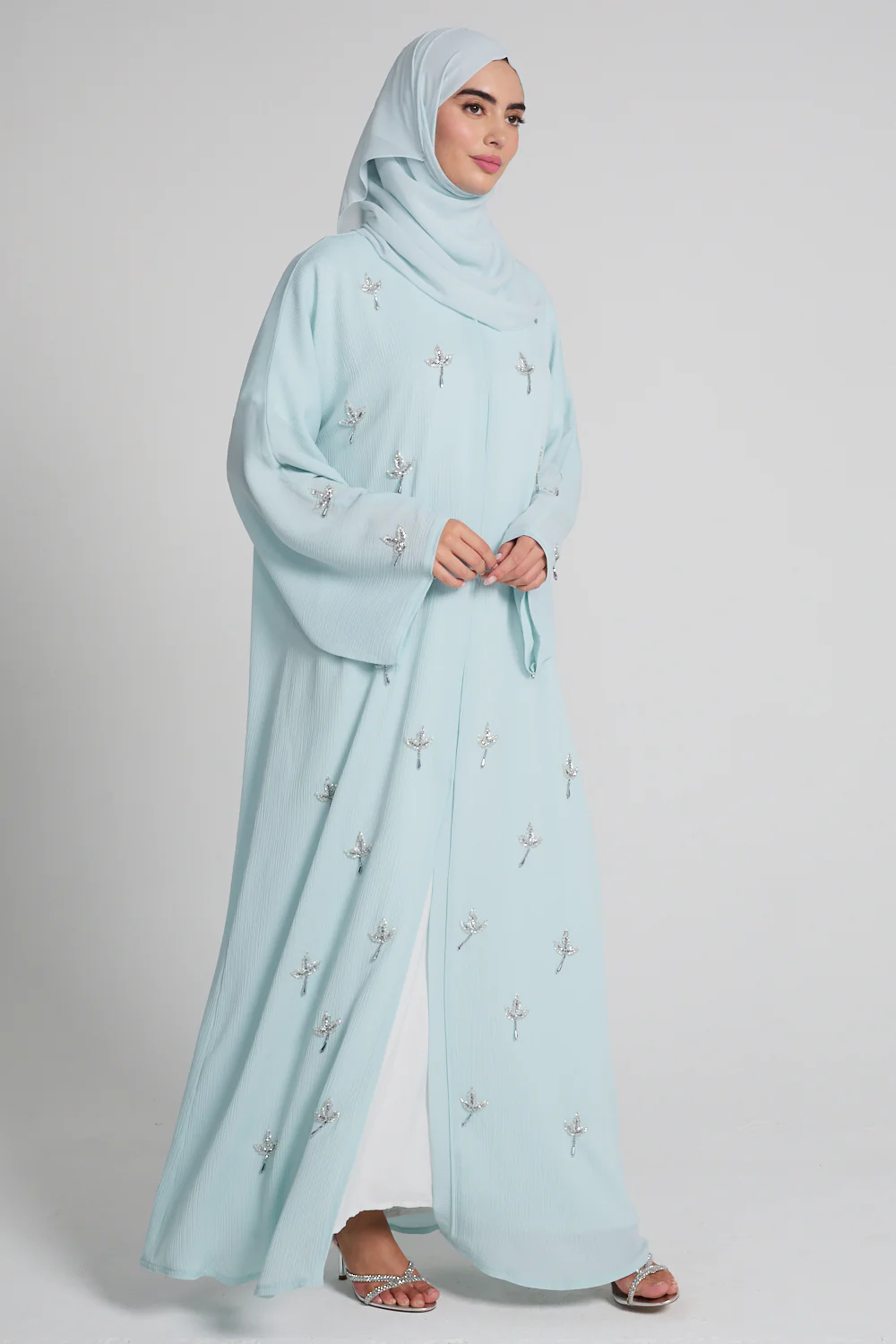 The Premium Textured Dewdrop Bloom Open Abaya in Tiffany Blue is crafted for the woman who embraces elegance with a touch of modern radiance. A soft, serene blue inspired by iconic sophistication feels fresh, luminous, and effortlessly captivating on every skin tone.