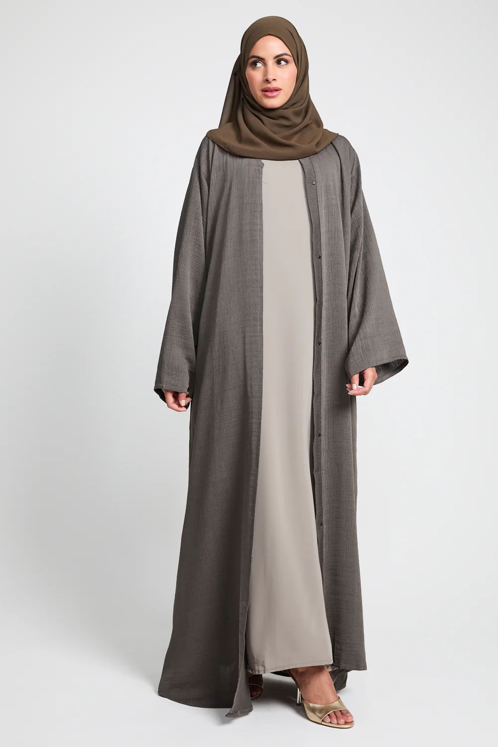 Discover refined ease with the Premium Textured Linen Blend Open Abaya in Olive Brown. A sophisticated neutral inspired by the grounded elegance of nature.