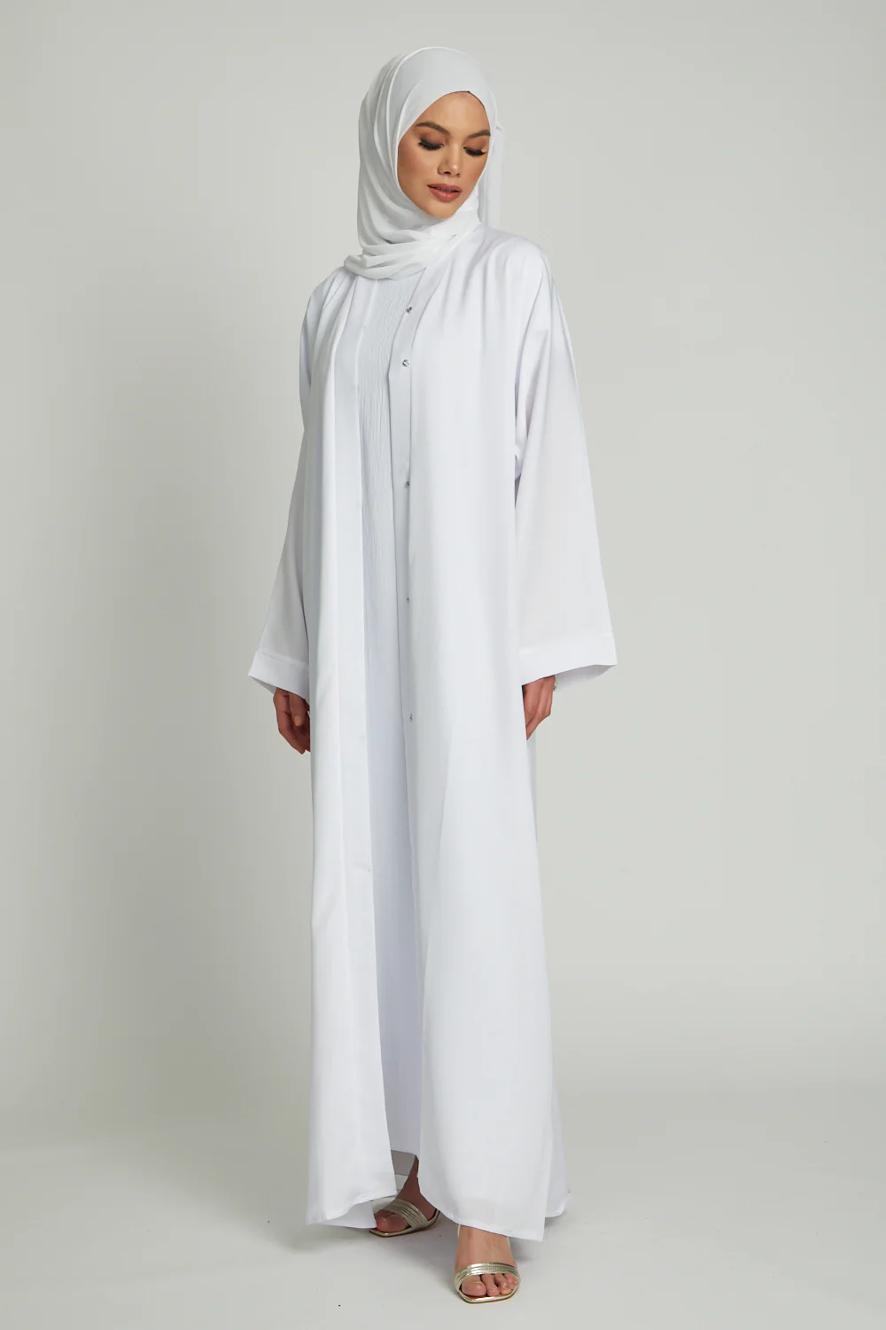 Our classic white open abaya is a versatile modest clothing essential suitable for day and evening wear. Its soft and lightweight nidha fabric means comfortable day-long wear, while its timeless white colour is effortless to accessorise with. Whether you're looking for a comfortable everyday modest fashion look or an elegant outfit for a special occasion, this plain white open abaya is the perfect piece, complete with a matching hijab and belt to help you complete the look.